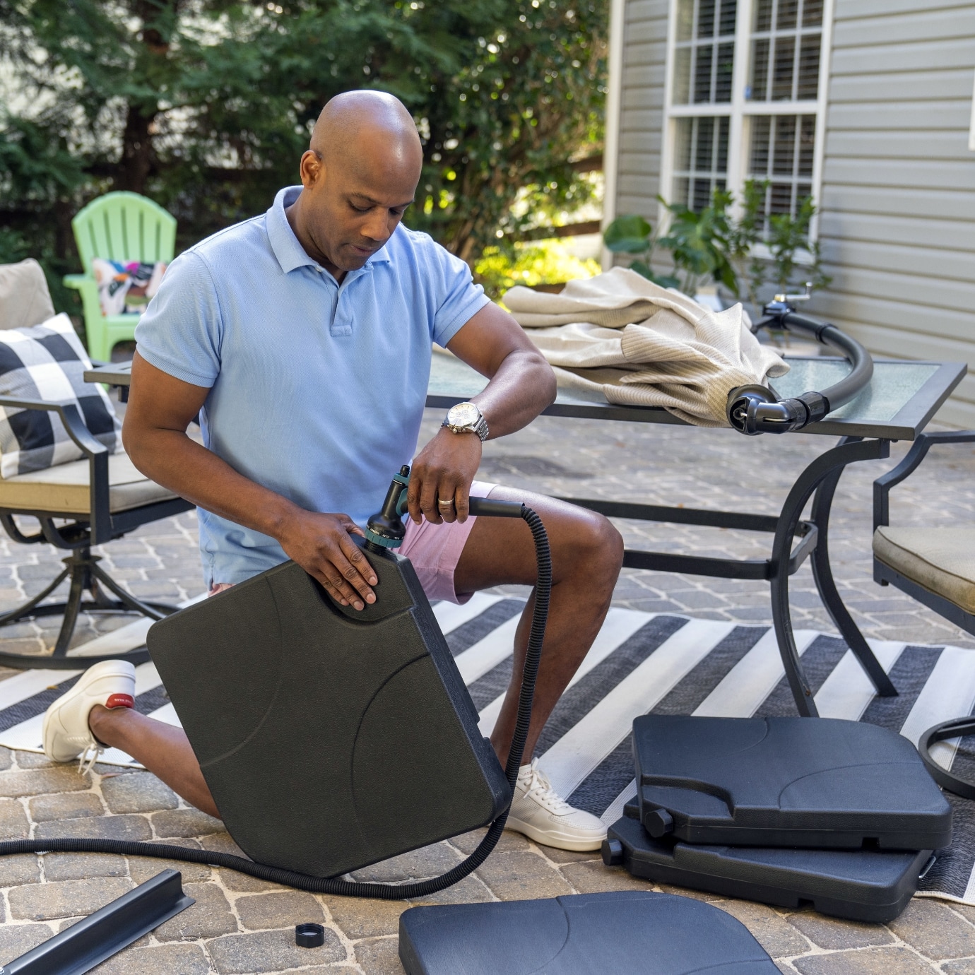Reinforced aluminum arms and a powder-coated steel pole ensure your umbrella stands strong season after season.