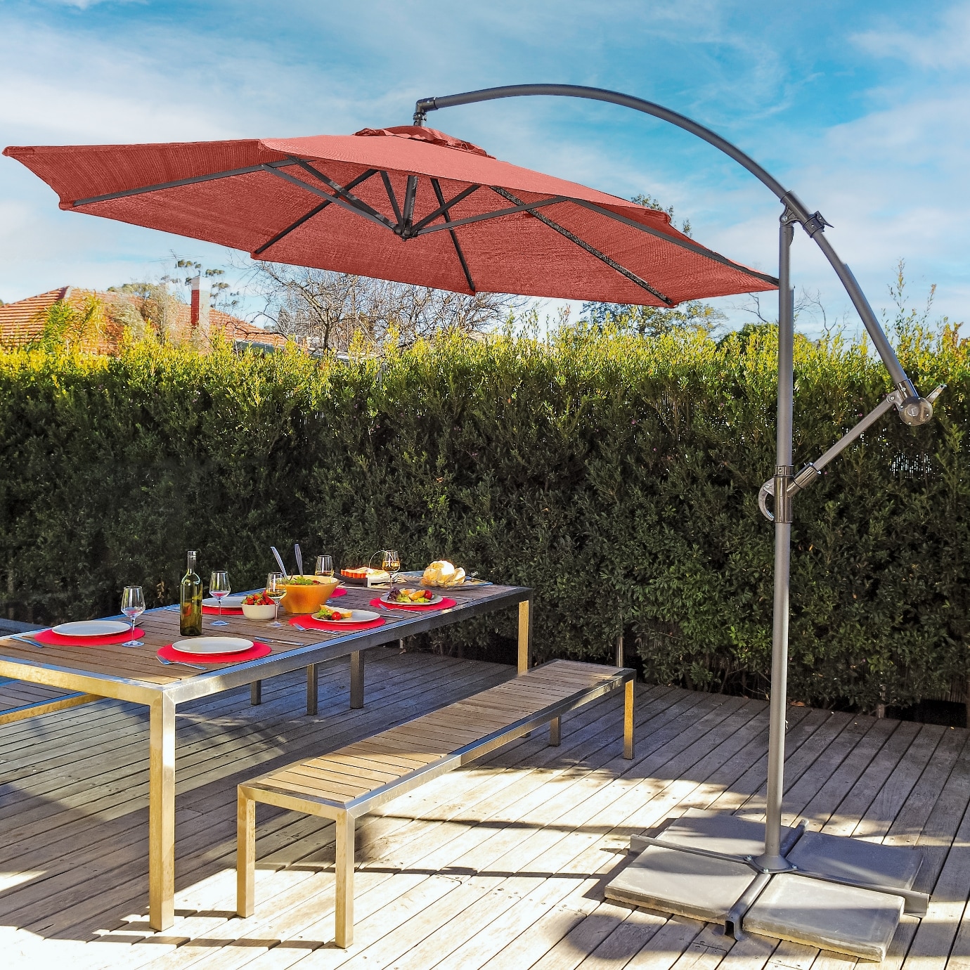The cantilever umbrella with base (base purchased separately) features a counterweight system that keeps your umbrella balanced and secure. Effortlessly adjust your shade without working up a sweat.